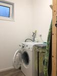 Eine Waschmaschine, Bügelbrett und Bügeleisen sind vorhanden.